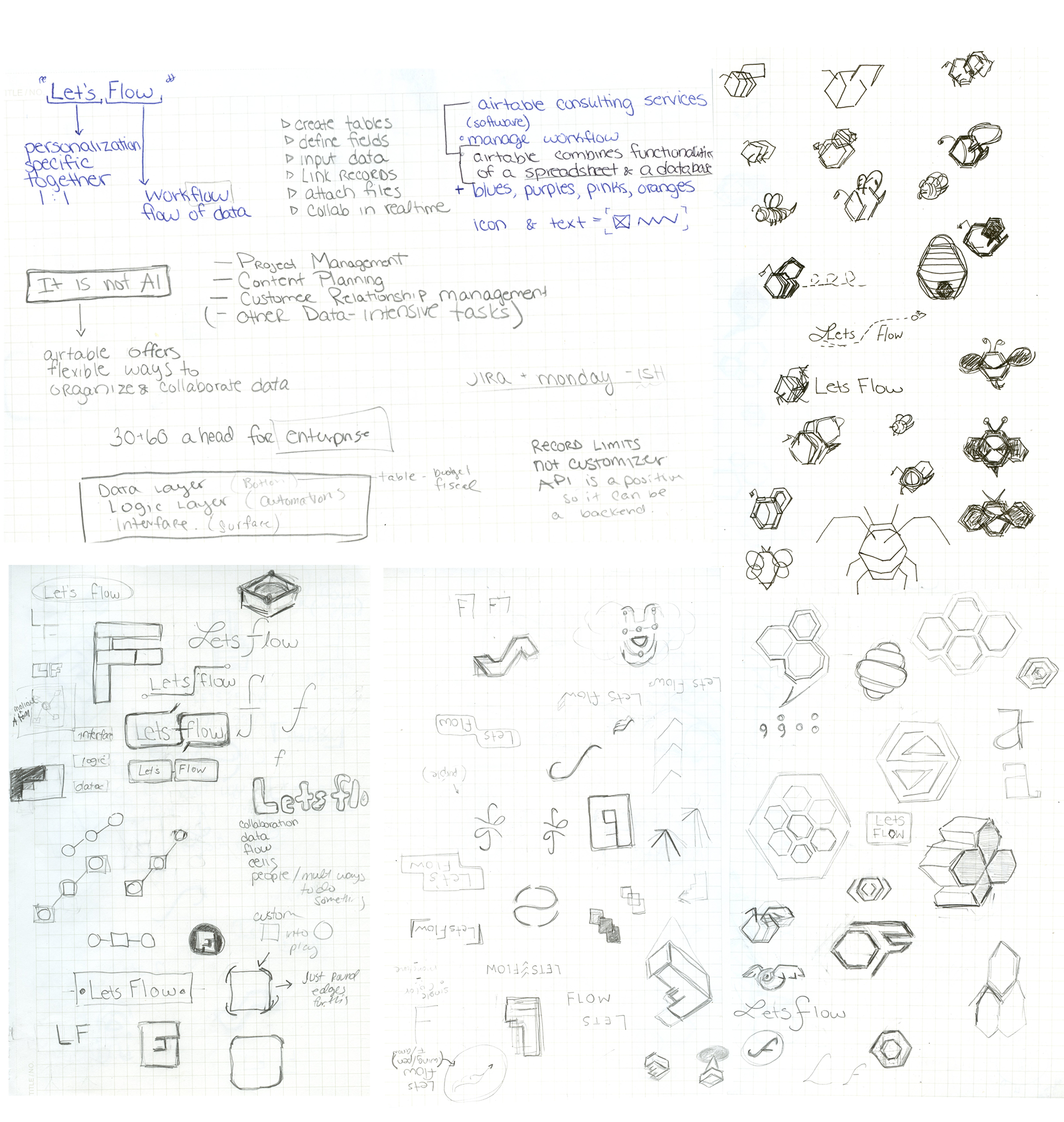 I was excited to collaborate with a colleague to create the logo for Let's Flow, a business offering Airtable consulting services for all workflows. After chatting with the client, it felt appropriate we land with a bee mascot to represent the hive-mind, worker bee which contributes to an ecosystem.